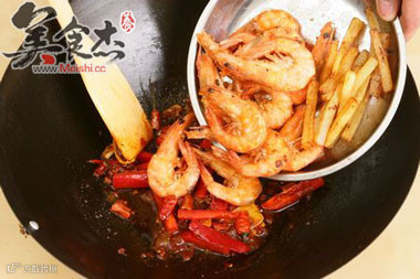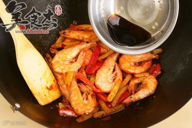 9、放入红椒略微翻炒后,将炸好的虾仁和土豆条放入