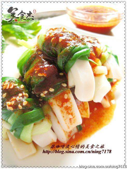 4、将韩式辣酱、白醋、糖、芝麻混合、调匀,浇在鱿鱼卷上,或者蘸食。