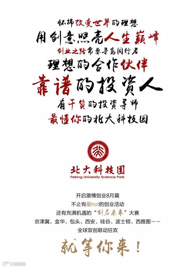 导读:盛夏8月,北大科技园“全国覆盖、全领域、全方位、立体化”系列双创活动持续升温。年度顶级创业赛事—“创启未来”2016国际青年科技创业大赛全球十大分赛场陆续开赛。小伙伴们还在等什么?带上你的梦想,带上你