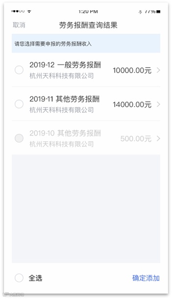 最后,选择相应劳务报酬收入并点击“确认添加”导入