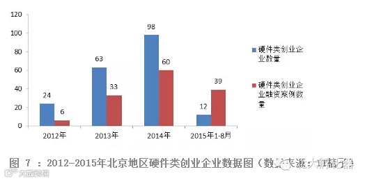 经过2013、2014两年的井喷式发展,2015开始,消费类智能硬件方面的创业开始有所降温,创业者在此领域的创业更为理性。根据IT桔子收录的北京地区硬件类创业企业数据,从2012年到2014年,创业企业数量快速增长,年增长率分别达162.5%和55%.6,同时,融资案例数量翻倍增长。但2015年以来,根据IT桔子1月至8月17日数据,该领域新创企业相比2014年同期大幅下降,创业投融资数据由于其延续性仍保持了较高热度,整体看,消费智能硬件类创业活跃度明显减弱。