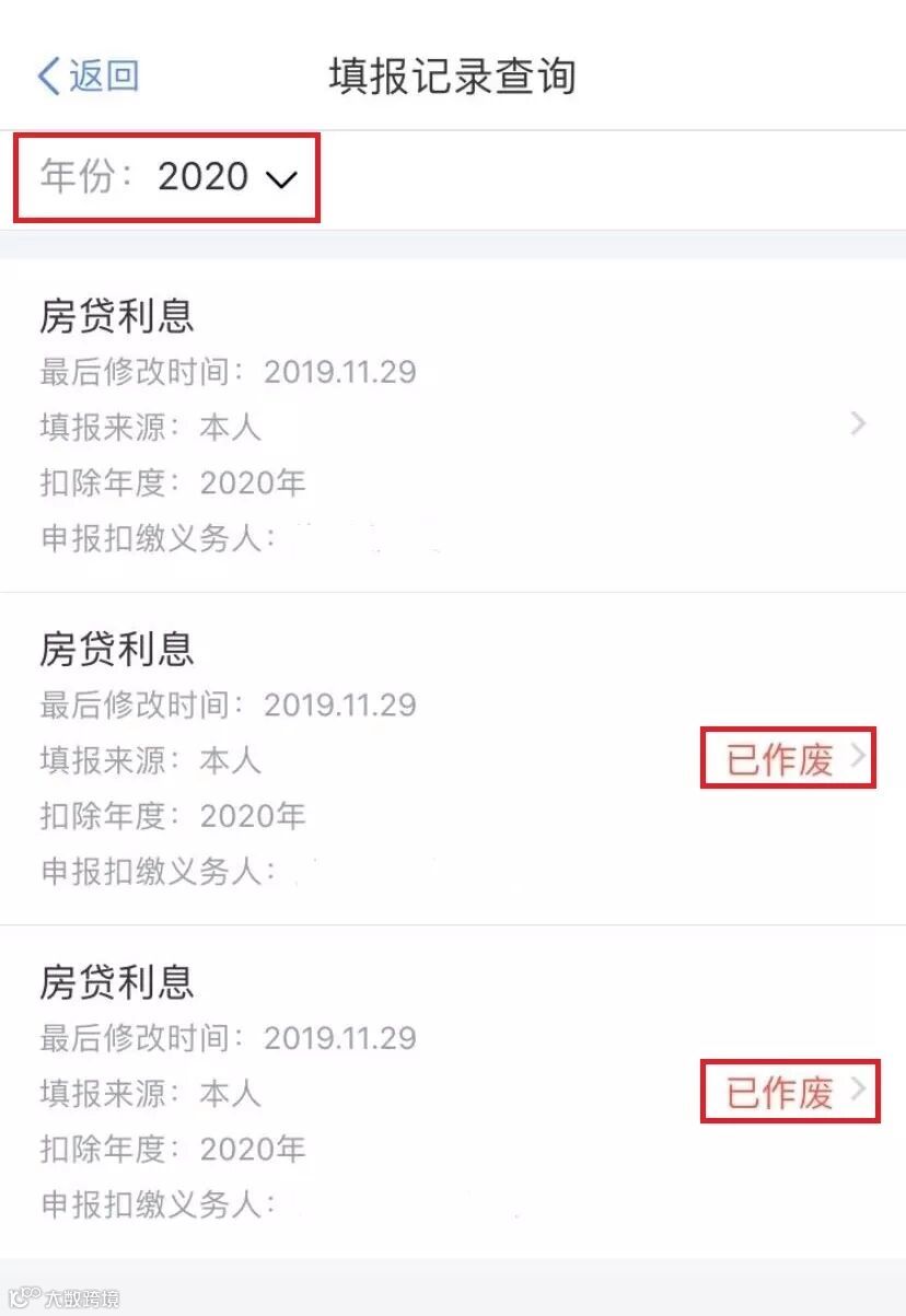 通过选择“年份2020”查看已提交的信息,如果发现有需要变动的信息,可以选择作废或修改。
