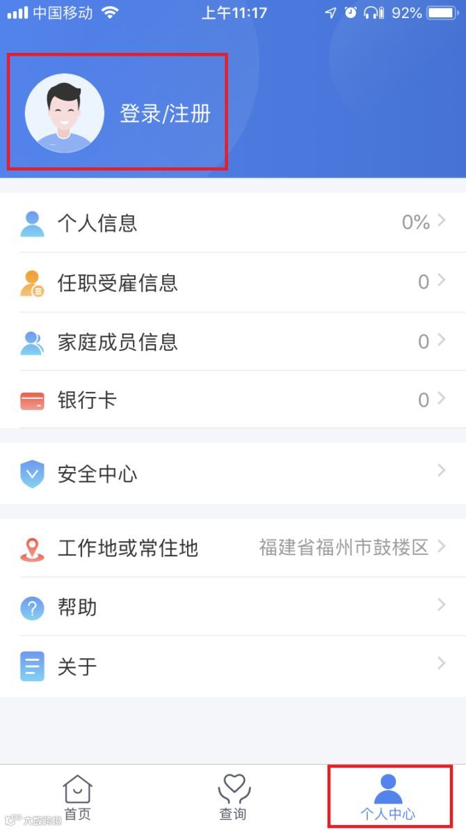 进入个人所得税APP首页,点击“个人中心”,选择“登录/注册”。