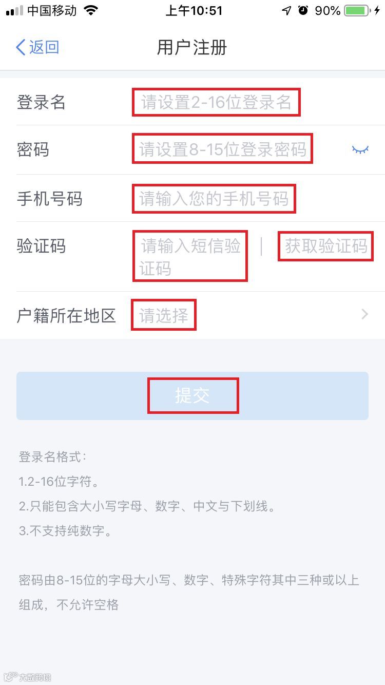人脸识别完成后,按要求输入登录名、密码、户籍所在地区等相关信息,并通过手机号码接收短信验证码,点击“提交”。