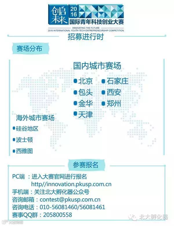 “创启未来”2016国际青年科技创业大赛报名详情及更多信息请登陆官方网站http://innovation.pkusp.com.cn,选择郑州城市赛进行报名。
