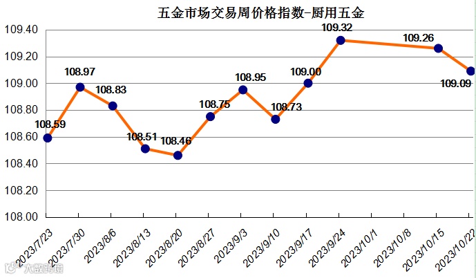 据监测,“世界·永康五金指数”五金市场交易周价格总指数上周(2023年10月16日至2023年10月22日)收于104.98点,较前一周小幅下跌0.07个百分点。
