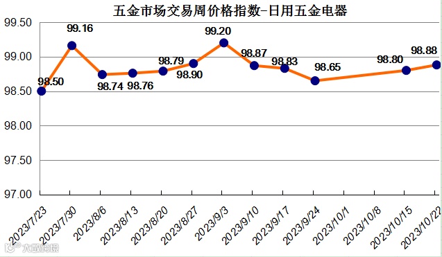 “日用五金电器”上周价格指数收于98.88点,环比上升0.08个百分点,升幅值位居十二大类第三。“日用五金电器”周价格指数的上升主要是受该类别下二级分类中的“家用五金制品”类商品价格上升影响,本周“家用五金制品”价格指数收于103.62点,环比上升0.30个百分点。