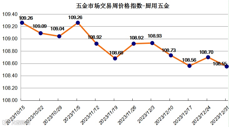 据监测,“世界·永康五金指数”五金市场交易周价格总指数上周(2023年12月25日至2023年12月31日)收于105.12点,与前一周基本持平。