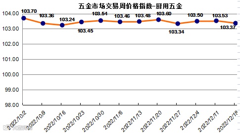“厨用五金”上周价格指数收于103.37点,较前一周下降0.16个百分点,降幅值位居十二大类第三。“厨用五金”价格指数的下降主要受该类别下二级分类中“炊具”类商品价格下降影响,本周“炊具”价格指数收于108.27点,环比下降0.52个百分点。