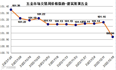 “建筑装潢五金”上周价格指数收于100.94点,较前一周下降0.22个百分点,降幅值位居十二大类第二。“建筑装潢五金”价格指数的下降主要受该类别下二级分类中“施工材料”类商品价格下降影响,本周“施工材料”价格指数收于111.01点,环比下降0.62个百分点。其个别规格品中的“土工布”商品价格较前一周下跌19.19个百分点。