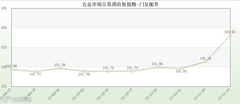 “门及配件”上周价格指数收于103.62点,环比上升1.31个百分点,涨幅位居十二大类之首。“门及配件”周价格指数的上升主要是受该类别下二级分类中的“门产品(整件)”类商品价格上升影响,本周“门产品(整件)”价格指数收106.39点,环比上升2.10个百分点。
