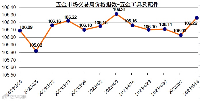 “五金工具及配件”上周价格指数收于106.26点,环比上升0.21个百分点,升幅值位居十二大类之首。“五金工具及配件”周价格指数的上升主要是受该类别下二级分类中的“电动工具”类商品价格上升影响,本周“电动工具”价格指数收于102.96点,环比上升0.52个百分点。其个别规格品中的“砂轮机”商品价格较前一周上升12.50个百分点。