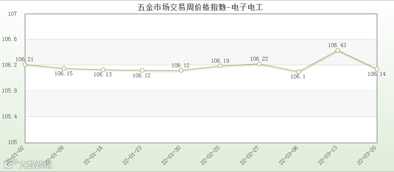“电子电工”上周价格指数收于106.14点,环比下降0.27个百分点。降幅位居十二大类第三。该类商品周价格指数的波动主要因素是受二级分类中的“电线、电缆”价格下降的影响,其周价格指数收于111.08点,环比下降1.71个百分点。