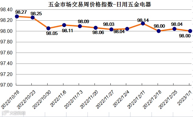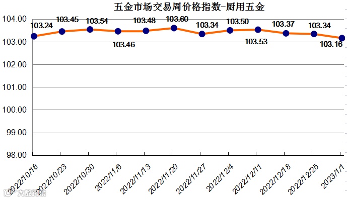 据监测,“中国·永康五金指数”五金市场交易周价格总指数上周(2022年12月26日至2023年1月1日)收于104.83点,较前一周微幅下跌了0.01个百分点。