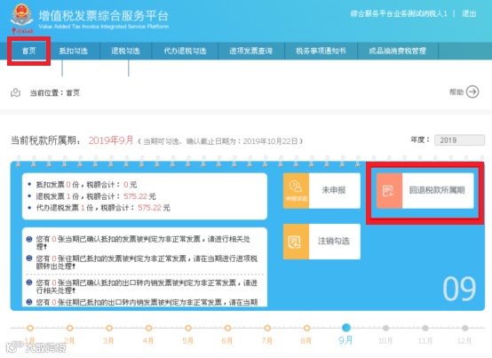 【第一步】点选“首页”,在工作台的当前税款所属期区域内便出现了“回退税款所属期”按钮。(只有企业符合回退条件时该按钮才会出现噢)