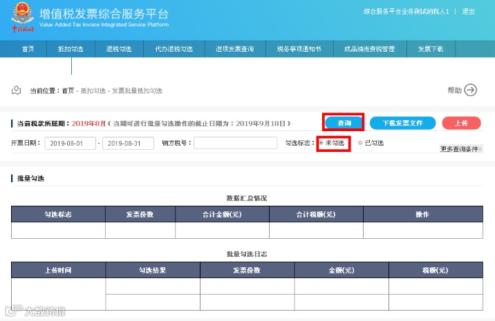 【第一步】在勾选标志选项中,选择“未勾选”选项后,用户可以对开票日期范围或销方税号进行设置,完成设置后,点击“查询”按钮。