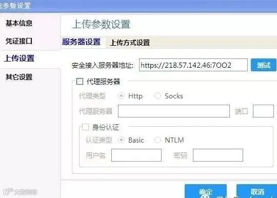 (2)进入开票软件中的“系统设置”参数设置“页面,核实安全接入服务器为(每个省不一样,山东省的是:https://218.57.142.46:7002)(必须在英文状态下输入),并测试与税局的服务器为连通状态;