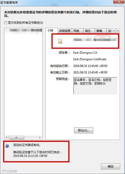 第二步,点击“签名属性”,选择显示证书,查看电子签章的具体信息,如下图所示,如果是真的电子发票,可以看到证书里“小结”下显示的单位信息与票面上红色发票专用章的单位信息是一致的,且下方注明“选定的证书路径有效”,签名时间与发票票面上的开票日期一致。