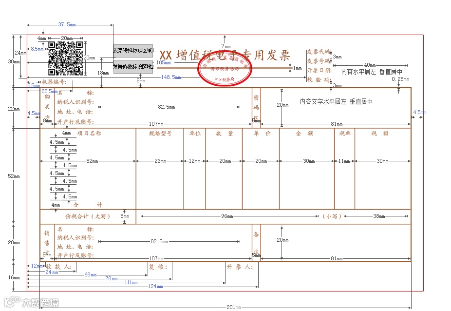 电子专票纵向分为票头、购买方、应税明细和合计、销售方和票尾五个部分,高度分别为30、22、52、20和16毫米。不包含票头、票尾的内框尺寸为201*94毫米。
