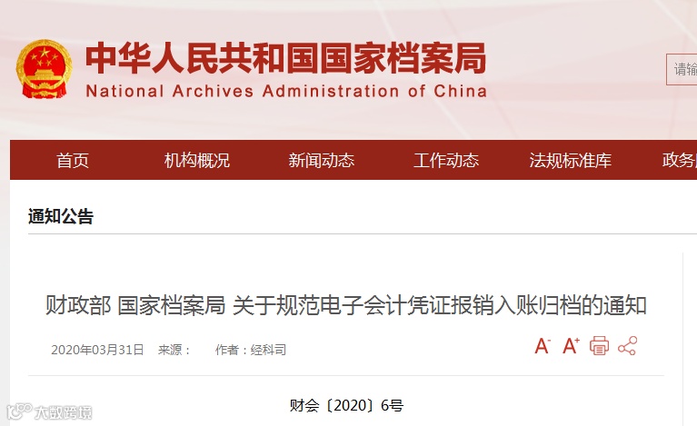 财政部 国家档案局 关于规范电子会计凭证报销入账归档的通知