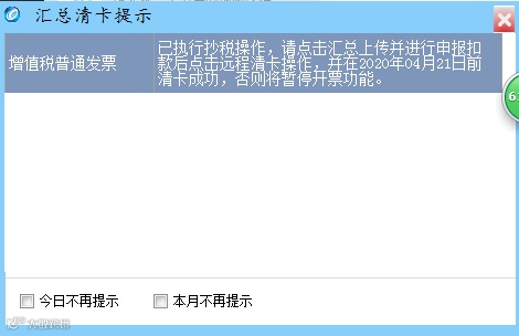紧急提醒,由于4月份是个大征期,按照以往的要求,所有的税控用户都要进行申报后才能清卡,但是由于今年的特殊情况,现在很多地市不再进行申报数据的一窗式比对就能进行清卡,因此,本月很多税盘用户,再进入开票后,税盘就会自动进行汇总上传和清卡,不需要先申报再清卡了!