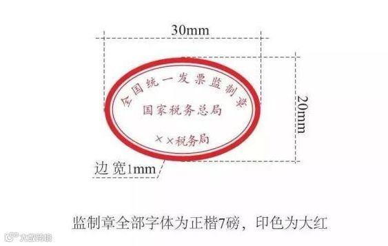 新启用的发票监制章形状为椭圆型,长轴为3厘米,短轴为2厘米,边宽为0.1厘米,内环加刻一细线,上环刻制“全国统一发票监制章”字样,中间刻制“国家税务总局”字样,下环刻制“××省(区、市)税务局”字样,下环字样例如:“江苏省税务局”、“上海市税务局”、“内蒙古自治区税务局”、“新疆维吾尔自治区税务局”。字体为楷体7磅,印色为大红色。新启用的发票监制章样式见上图。