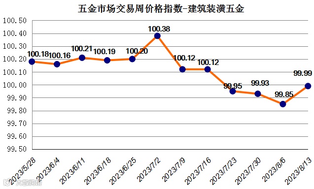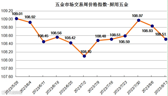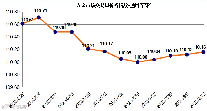据监测,“中国·永康五金指数”五金市场交易周价格总指数上周(2023年8月7日至2023年8月13日)收于104.83点,较前一周小幅下跌0.08个百分点。