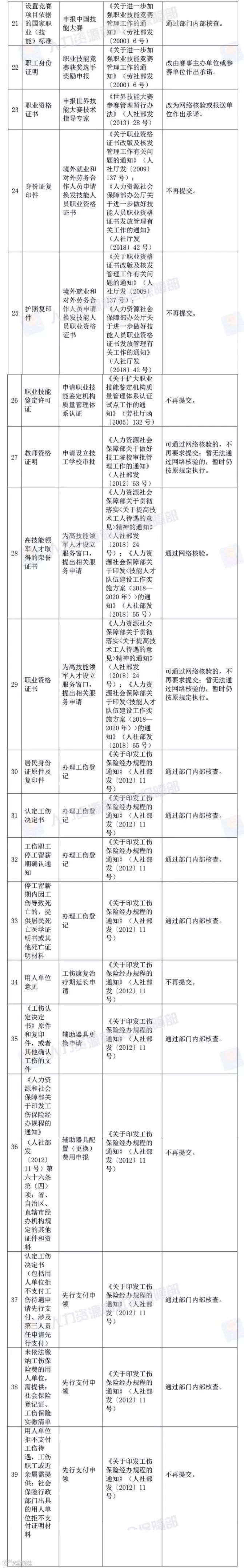 人社部近日公布决定,取消73项由规范性文件设定的证明材料,包括申报职业技能鉴定的身份证明、结业证书、职业资格证书;办理工伤登记的居民身份证原件及复印件、认定工伤决定书;劳动能力鉴定登记时的劳动能力鉴定结论书,等等。