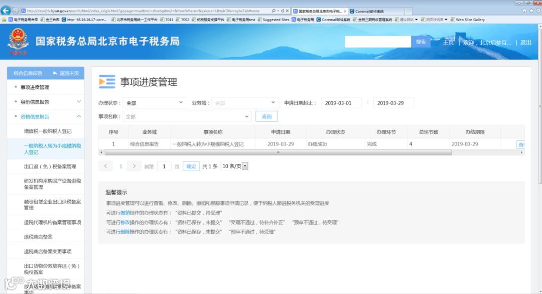 选择“资格信息报告”——“一般纳税人转为小规模纳税人登记”