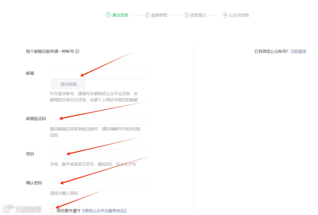 在注册页面中,输入你的邮箱地址,并点击“激活邮箱”,获取并输入邮箱验证码,然后填写能记住的密码(字母、数字、英文符号组成的,最短8位,区分大小写 ,再次填写密码,最后勾选“我同意并遵守协议”)。