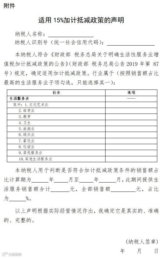 符合《财政部税务总局关于明确生活性服务业增值税加计抵减政策的公告》(财政部税务总局公告2019年第87号)规定的生活性服务业纳税人,应在年度首次确认适用15%加计抵减政策时,通过电子税务局(或前往办税服务厅)提交《适用15%加计抵减政策的声明》(见附件)。
