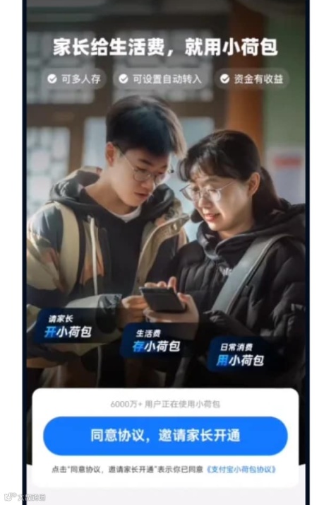 家长支付宝点击邀请或通过支付宝扫邀请码开通小荷包。