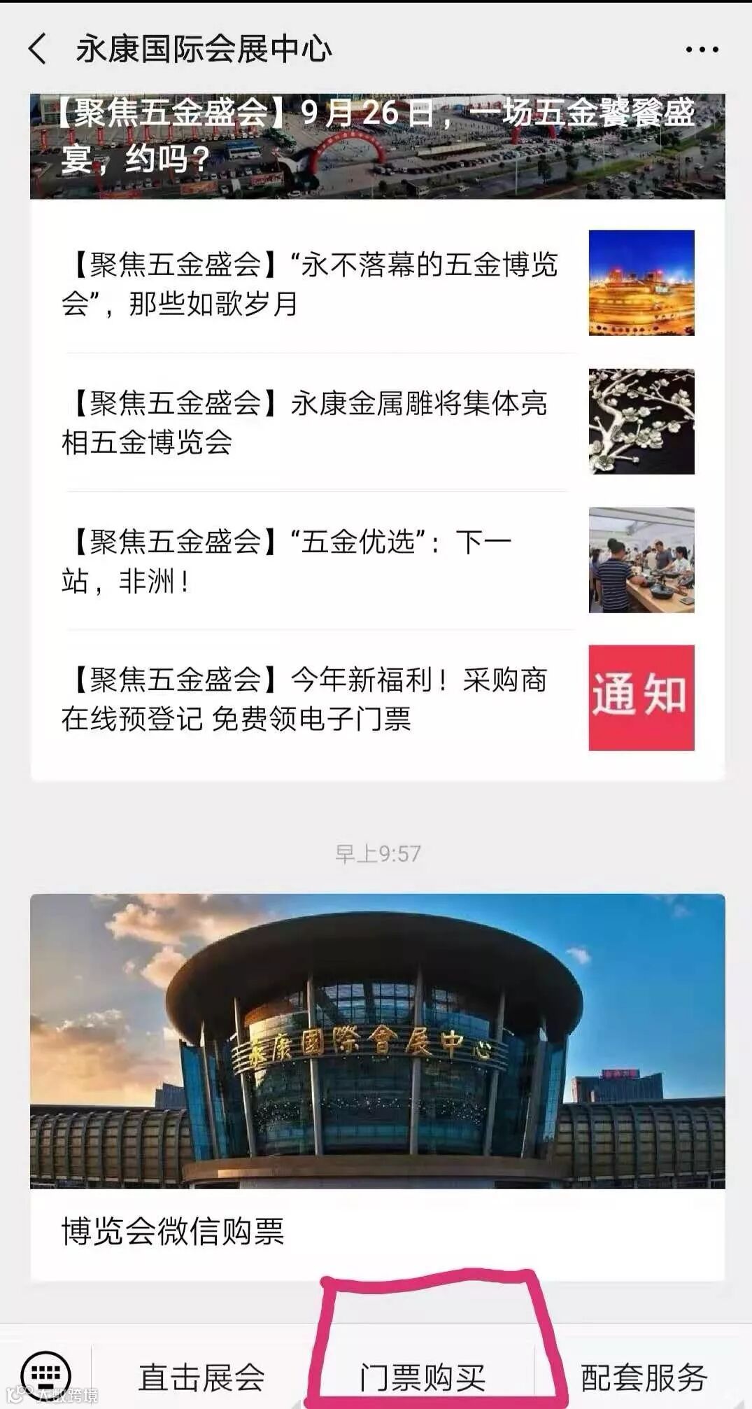 自9月23日起,第24届中国五金博览会微信购票平台正式开放售票。关注“永康国际会展中心”微信公众号,填写相关信息后通过微信支付购票。