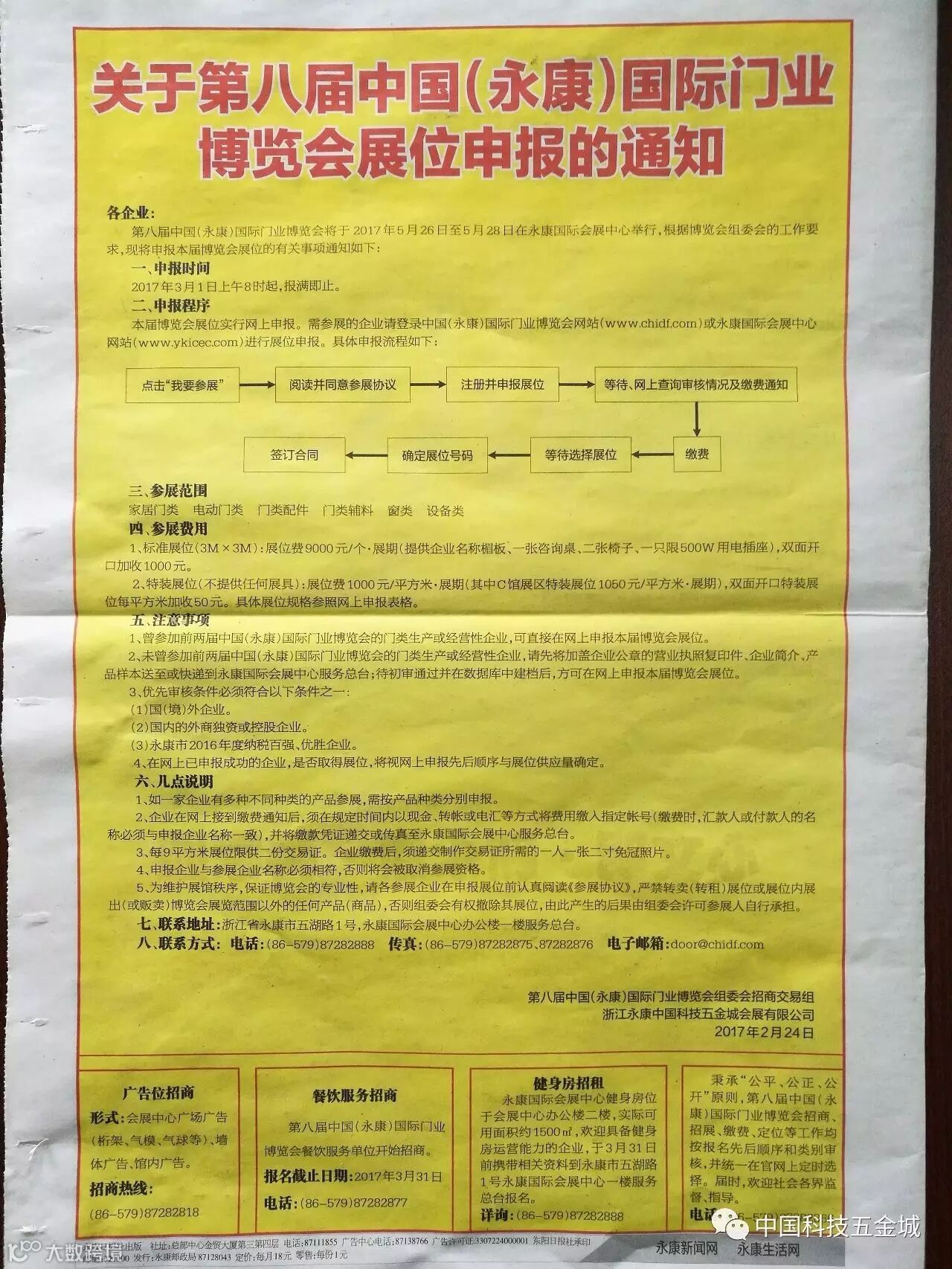 昨日,记者从五金城会展有限公司获悉,第八届中国(永康)国际门业博览会网上展位申报将于3月1日上午8时正式开始。需参展的企业可登录中国国际门业博览会网站(www.chidf.com)或永康国际会展中心网站(www.ykicec.com)进行展位申报。