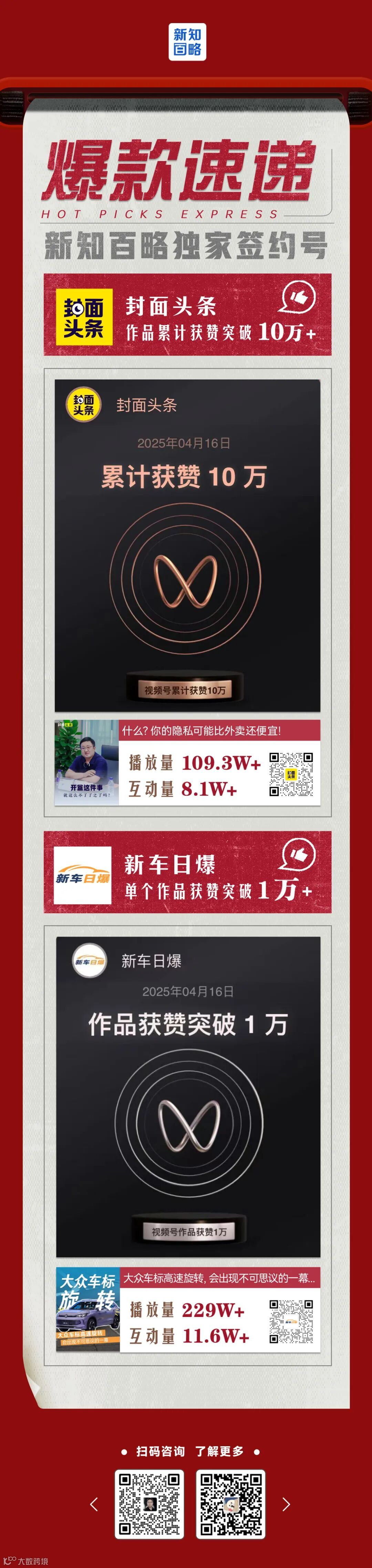 导读:🎈封面头条累获赞10W+、单条播放破109万互动8.1万!!!🚗新车日爆单条播放229W+、获赞破万!!