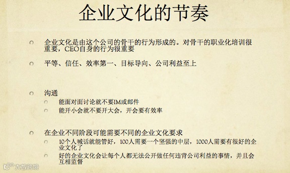 企业文化其实是一个逐步形成的东西,很难从外部迁移进来,不是请两个讲师讲一讲就形成了企业文化,这是非常困难的。企业文化是由组成的人形成的,尤其是CEO自己就代表企业文化。说实在的,我也不是什么专家,(但)我觉得企业文化非常重要。尤其在公司快速成长(的时候),十个人以内不需要企业文化,一百个人的时候可能需要,一百个人至少有一点骨干开始解决这些人的沟通方式。到一千个人以上的时候,没有企业文化发现是一团糟。