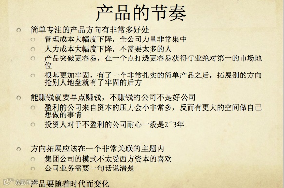 我觉得产品最重要一点是简单。一个公司,不太可能做太多的事情,我相信在座没有几个超级牛人,一般人能把一件事情做到极致做透,已经很了不起了。只做一件事情,你不需要招那么多人,不会存在两个部门抢资源的问题。你只做一件事情,突破是很容易的,因为你就是围绕一个点,每天就在琢磨一个点,前提条件是你这件事情的方向要选对。