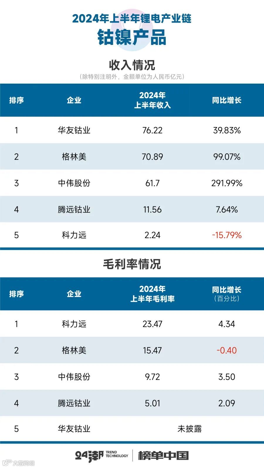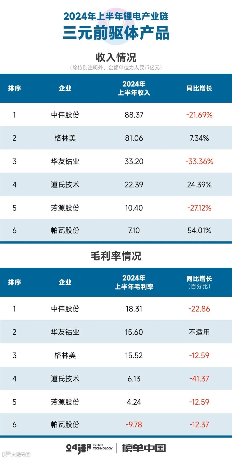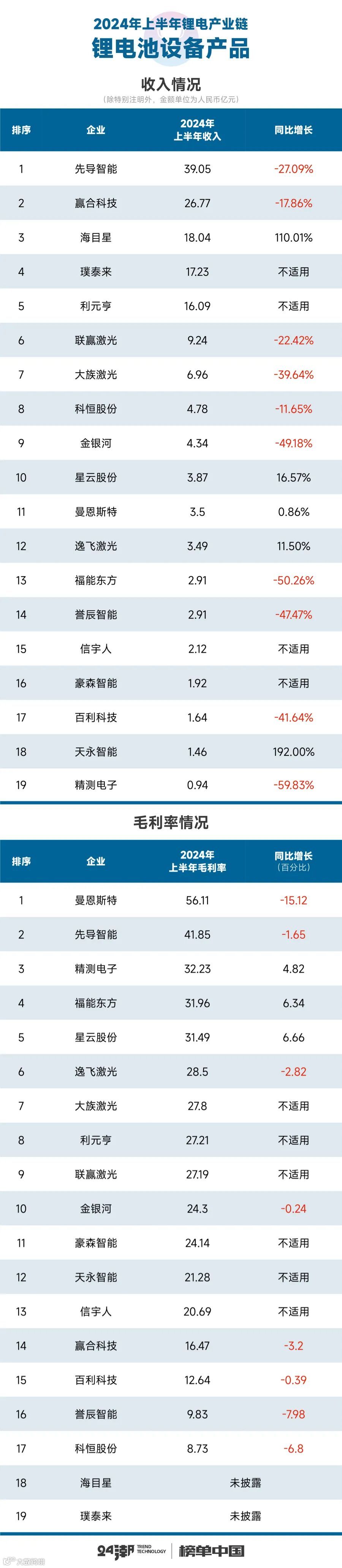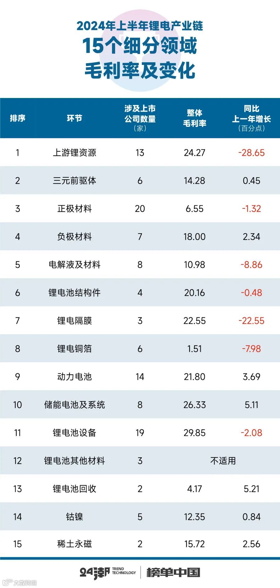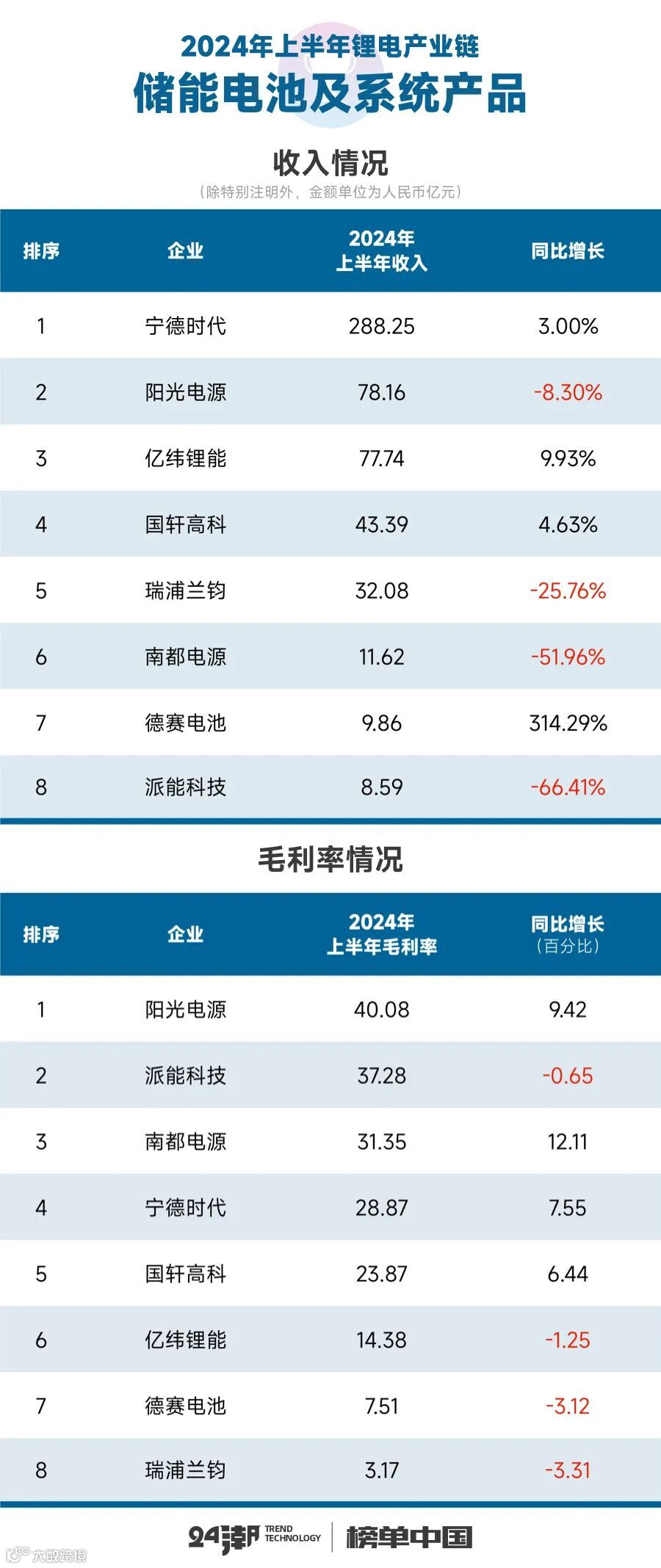 事实上,这一切已经在企业最新财报(2024年半年报)中有所体现。据24潮产业研究院(TTIR)统计分析100多家锂电上市公司财报发现,2024年上半年整个锂电产业链上市公司营业收入合计为4708.10亿元,约同比下降了20.21%;整体毛利率为18.94%,约同比下降了2.26个百分点。