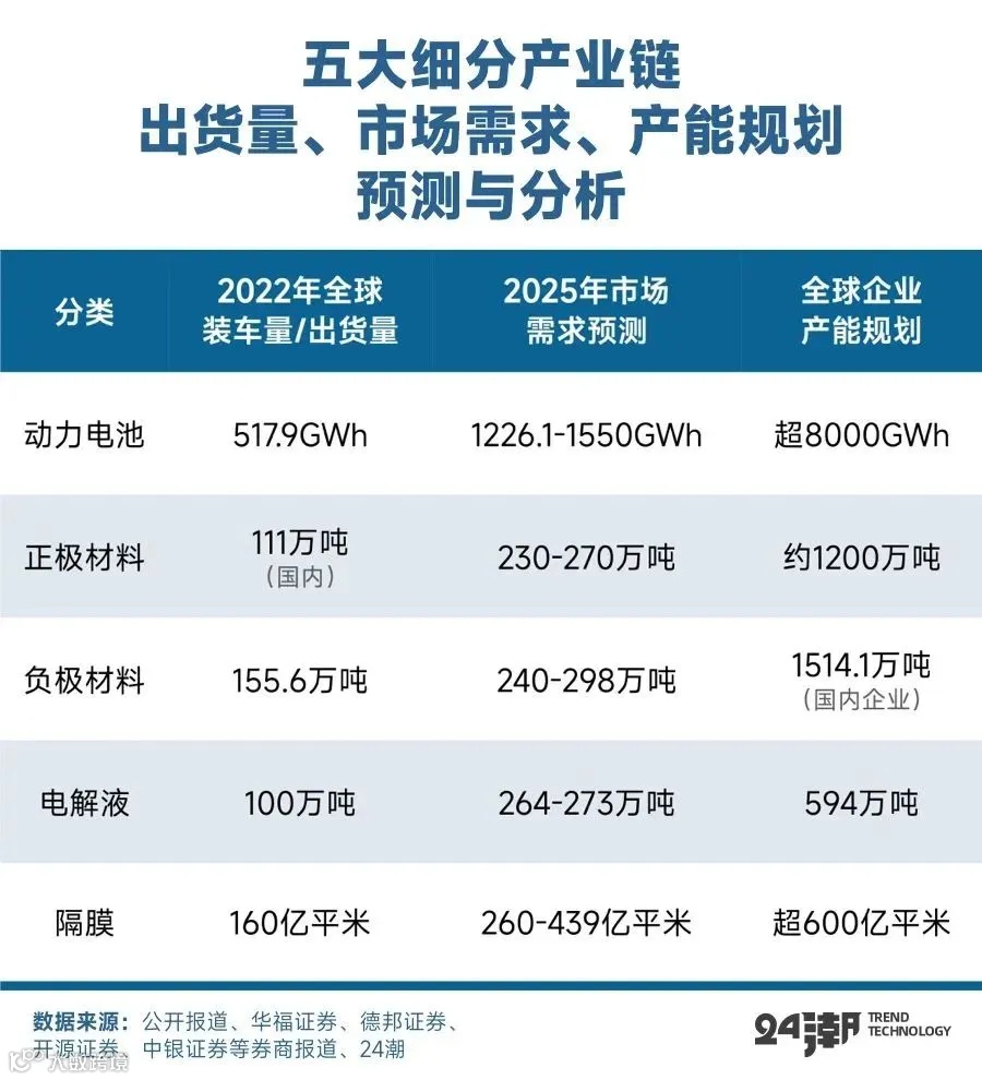 另据24潮产业研究院(TTIR)此前统计数据显示:截止目前,在动力电池、储能电池、正极材料、负极材料、电解液与锂电隔膜这6大核心赛道上,已知的企业产能规划均远超2025年第三方研究机构对市场需求的预测上限,未来三年内产业大洗牌已经不可避免。(各细分产业链企业产能规划情况详见 “中国锂电的火与冰” 一文)