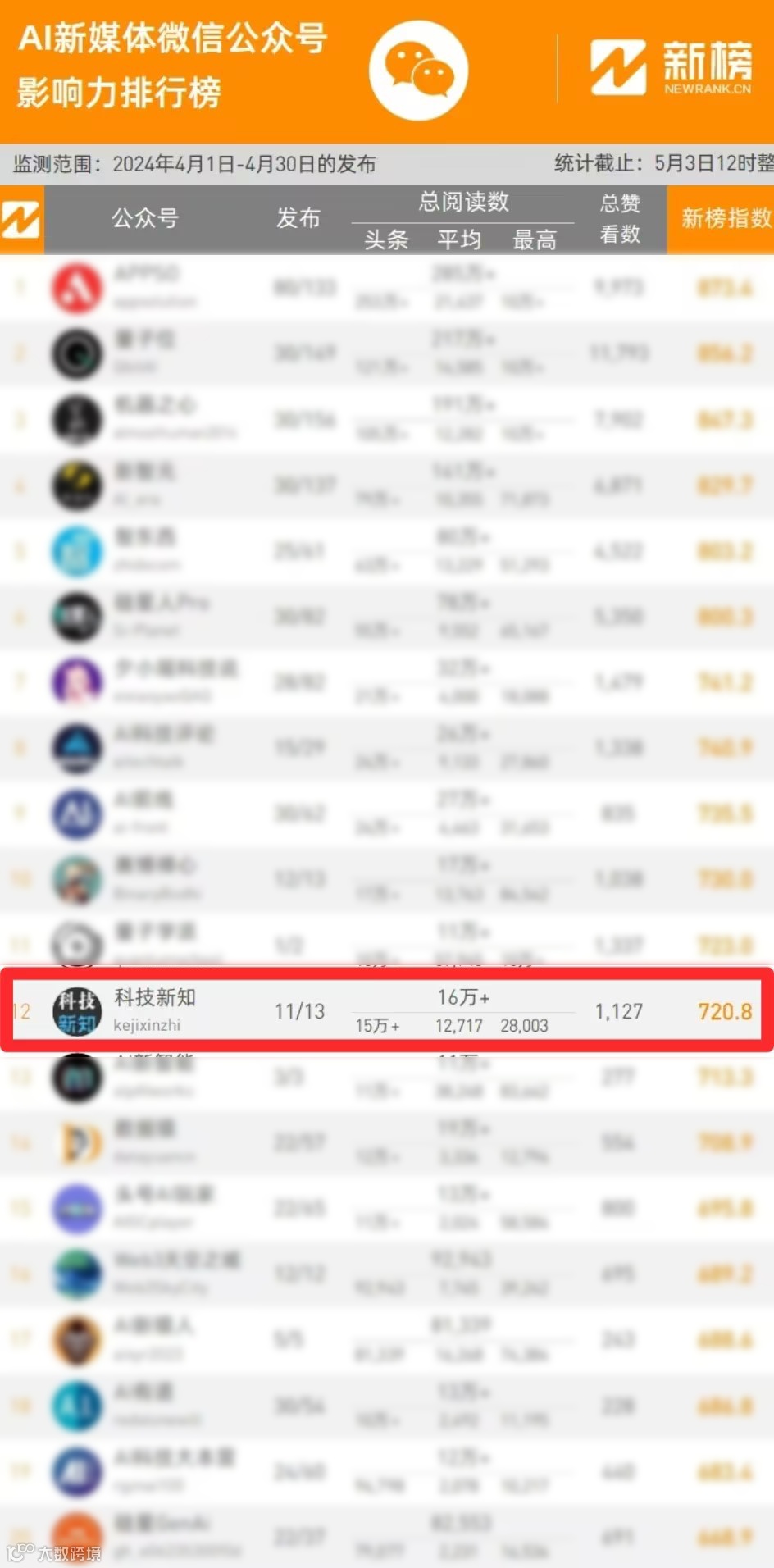 从3月份开始,我们的公众号就展现出了强大的竞争力,从同类视频号中脱颖而出!在4月份的榜单上,我们更是勇夺TOP12的位置,证明了我们在科技领域的专业性和影响力。而到了5月份,我们再次刷新了自己的记录,以TOP7的成绩稳居前列!
