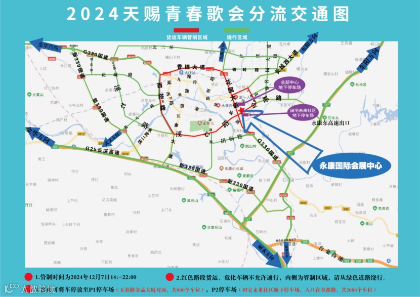 一、12月7日14:00至22:00天赐青春歌会音乐节期间,禁止除天赐青春歌会音乐节指定车辆外的其它车辆进入永康国际会展中心,永康国际会展中心周边道路作为交通集散主要通道禁止社会车辆停放。