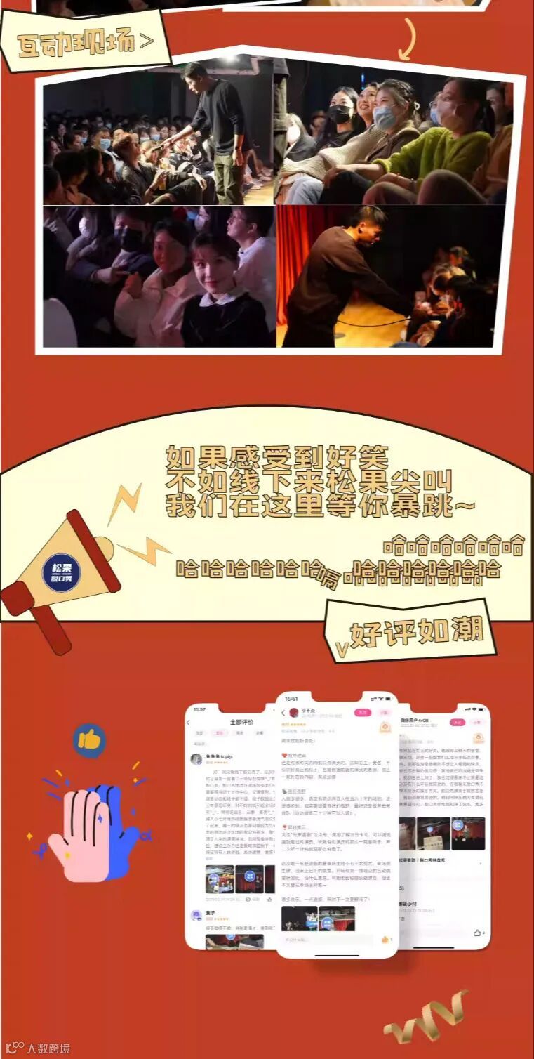 至今已演出5000余场,观演人次达60w人,汇集全国优秀喜剧演员;依靠有口皆碑的演出质量和脱口秀演出市场的繁荣,松果喜剧的演出场场爆满~
