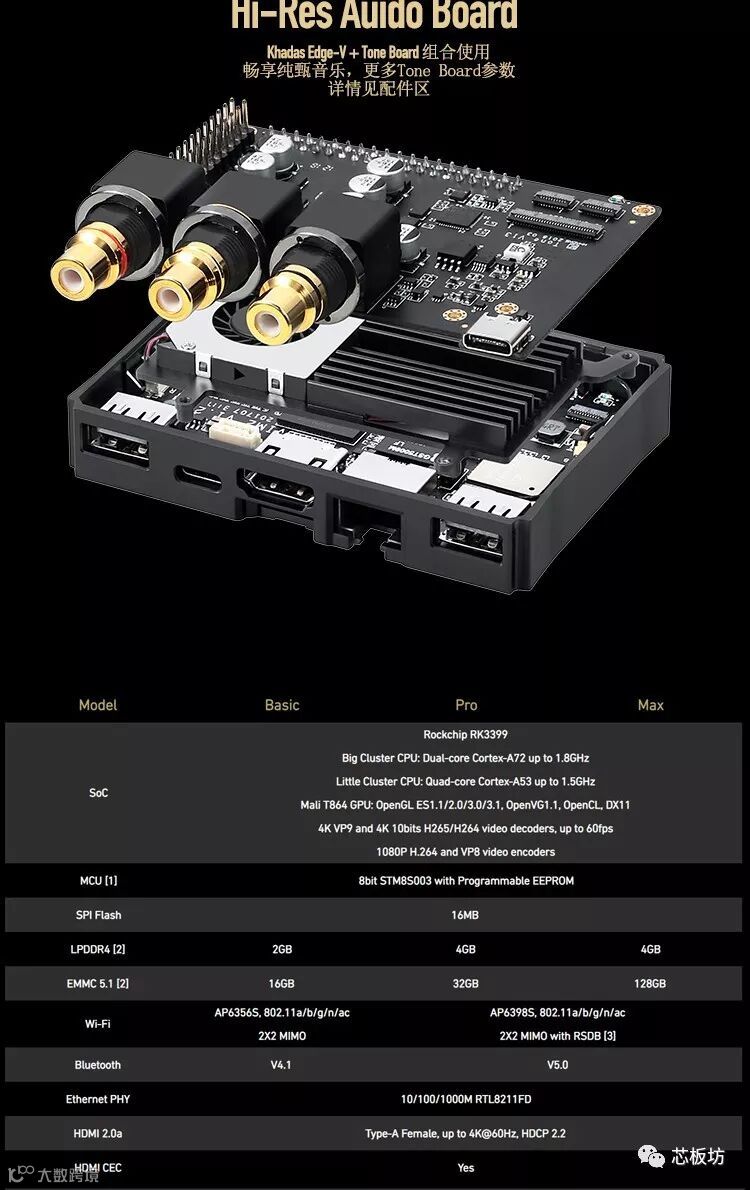 Khadas Edge-V RK3399的版型相对小巧紧凑,沿用了VIMs系列的版型。硬件配置上,Khadas Edge-V RK3399与其他RK3399板子差不多,但是内存规格使用LPDDR4算是一个小小的亮点。这块板子最大亮点是可以实现高保真音频播放功能,可以完美地使用Khadas的高保真声卡扩展板,音乐发烧友千万不要错过。