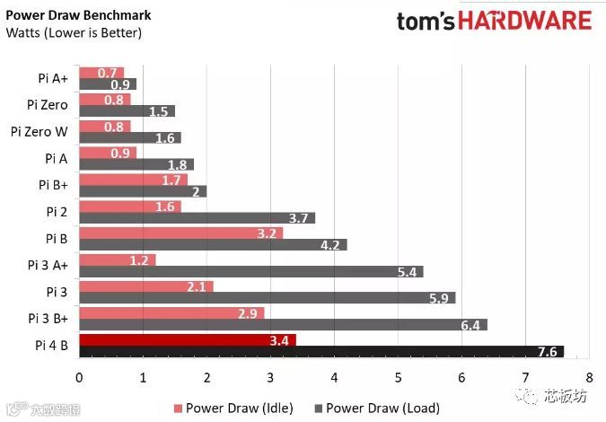 由于升级到4核A72,树莓派4的功耗提高了,但是只比3B+高了不到20%,考虑到CPU性能有4倍的提高,所以总效能还是提高的。