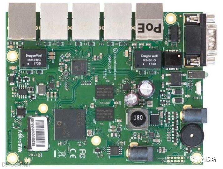 今天,芯板坊带来了基于高通IPQ4019四核处理器芯片的一款路由器开发板MikroTikRB450Gx4,该板子提供了6个千兆以太网接口、一个串口、两个电源接口和一个microSD卡插槽。