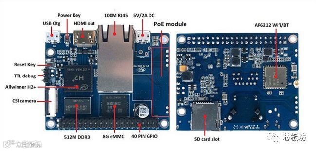 BPI-P2 Zero搭载全志H2+处理器、512MB内存、百兆以太网支持POE,Wifi和蓝牙以及一个mini HDMI和8GB eMMC。当然,这说的是全配,也有低配版本。