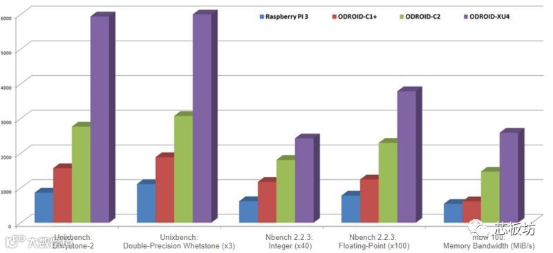 下图是各系列板子的CPU计算性能对比,测试软件是开源的unixbench,柱状图越高代表性能越好。其中蓝色的是大家熟悉的树莓派3,绿色的就是Odroid C2.
