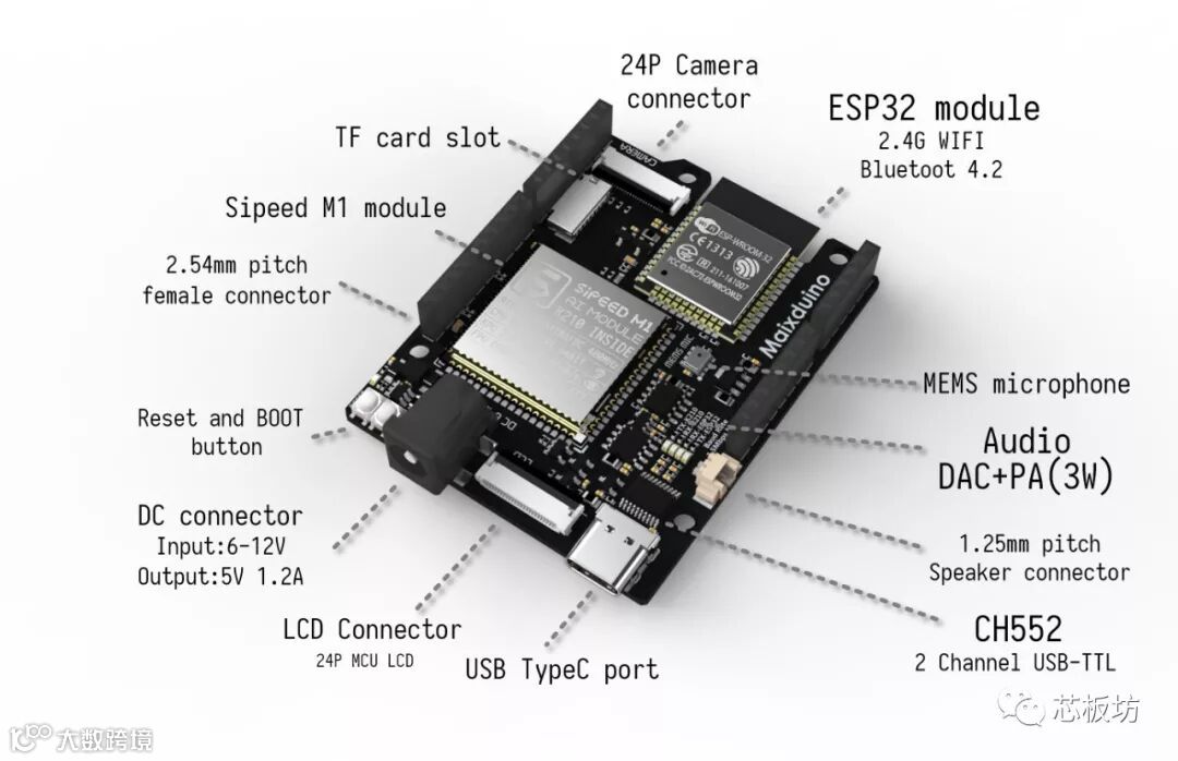 ● AI模块 --- Sipeed M1: 包含Kendryte K210 双核 RISC-V 处理器 @ 600 MHz,KPU 卷积神经网络加速器,APU音频加速器,8MB通用SRAM,其中5.9MB用于AI SRAM。