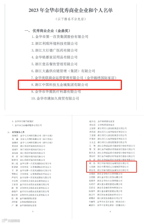 近日,2023年度金华市优秀商业企业和个人名单出炉,五金城集团荣获2023年度金华市优秀商业企业“金鼎奖”,公司员工胡俊、王郑鹏、胡宏亮被评为商贸服务之星。