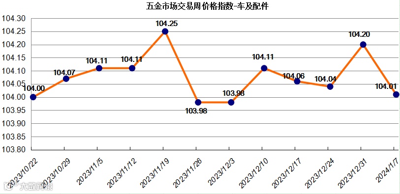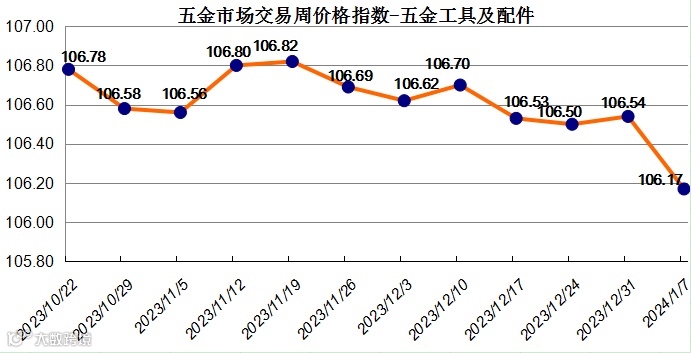 据监测,“世界·永康五金指数”五金市场交易周价格总指数上周(2024年1月1日至2024年1月7日)收于105.01点,较前一周小幅下跌0.11个百分点。